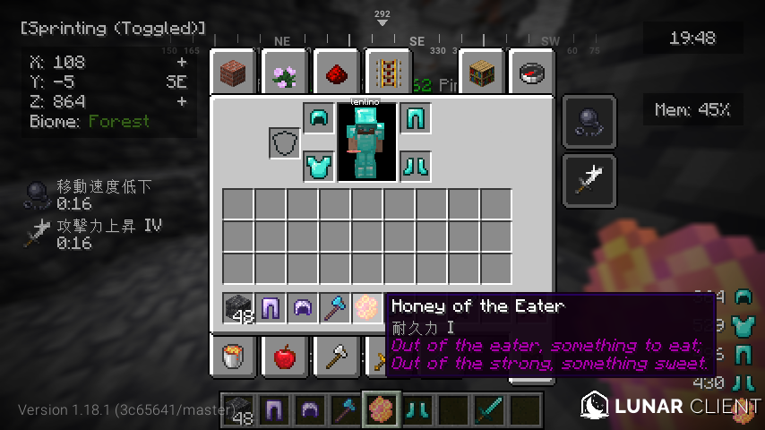 なかなかドロップしないのでコマンドで出します。『Honey of the Eater』を出しました。手にもつと、移動速度低下と攻撃力上昇がつくアイテムです!