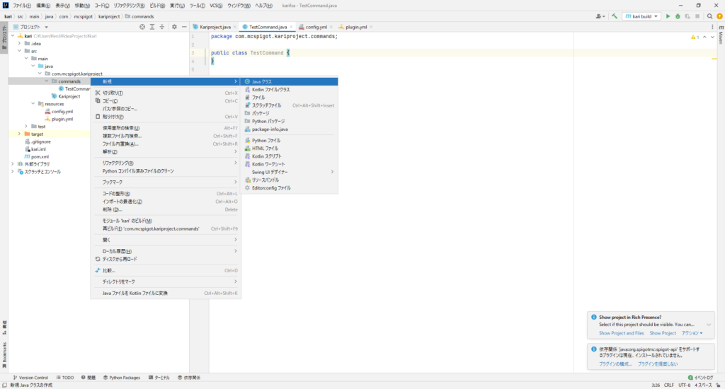そして、commandsの中にJAvaクラスを新規作成します。