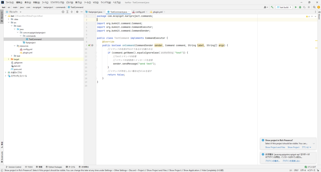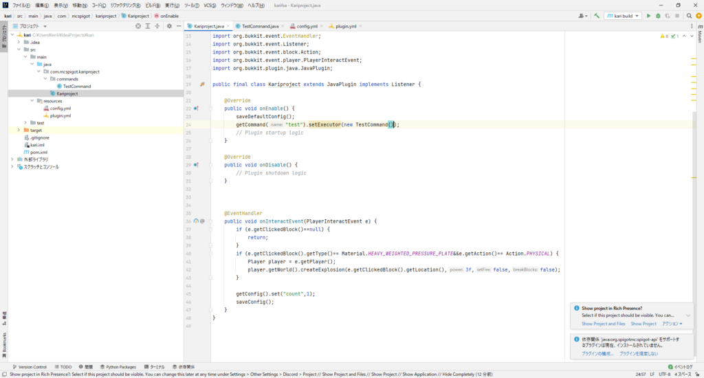 あとはメインクラスでコマンドをSpigot側に認識させるために、onEnableの中にコマンドを登録するコードを追加します。getCommand(“test").setExecutor(new TestCommand());