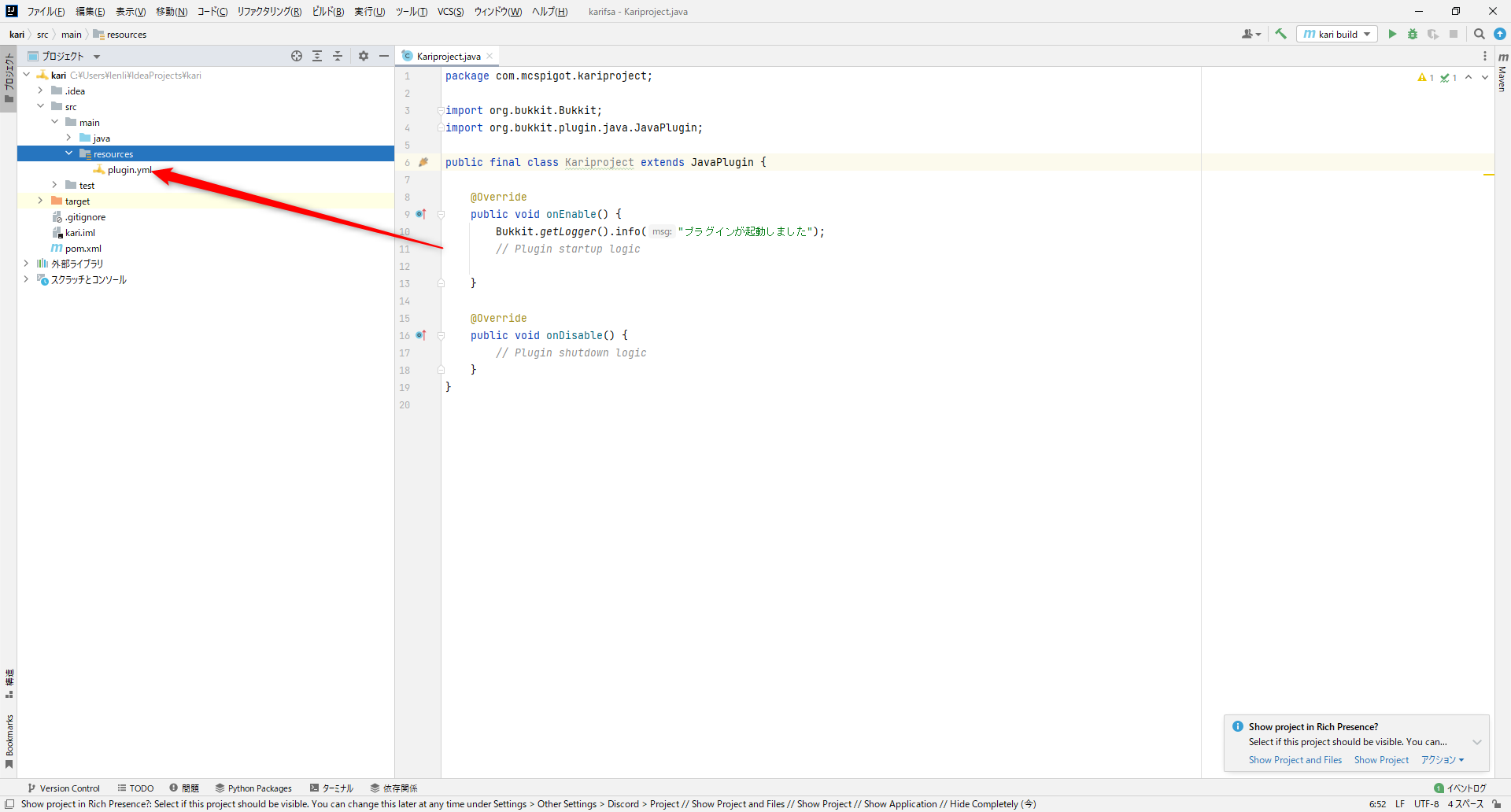 左のメニューからsrc\main\resources\plugin.ymlの順にクリック