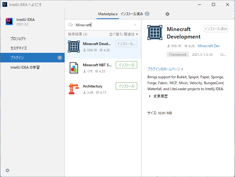 検索欄にMinecraftと入力、Minecraft Developmentをインストール。これはIntelliJ IDEAでプラグインを作成するために必須のプラグインです。