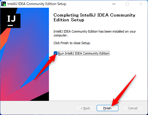Run IntelliJ IDEA Community Editionにチェックをつけてから、Finishをクリック
