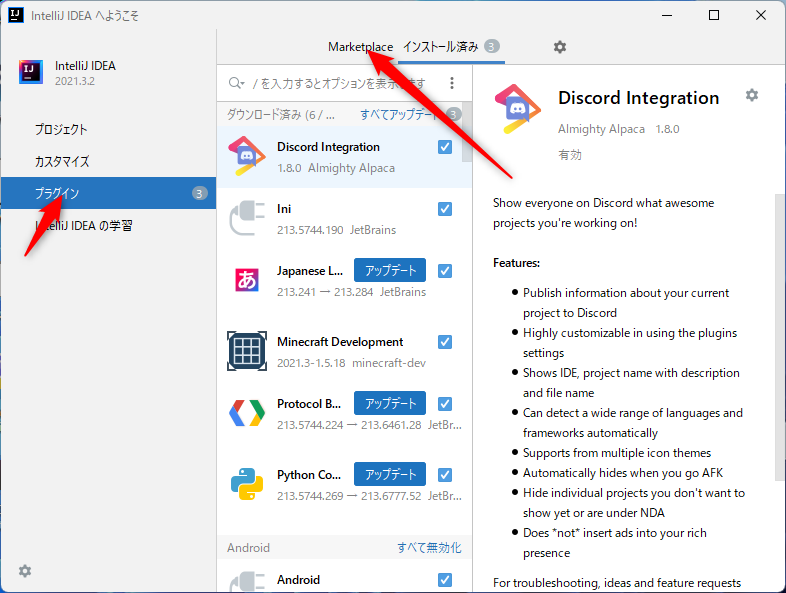 プラグインをクリックしてMarketplaceをクリック